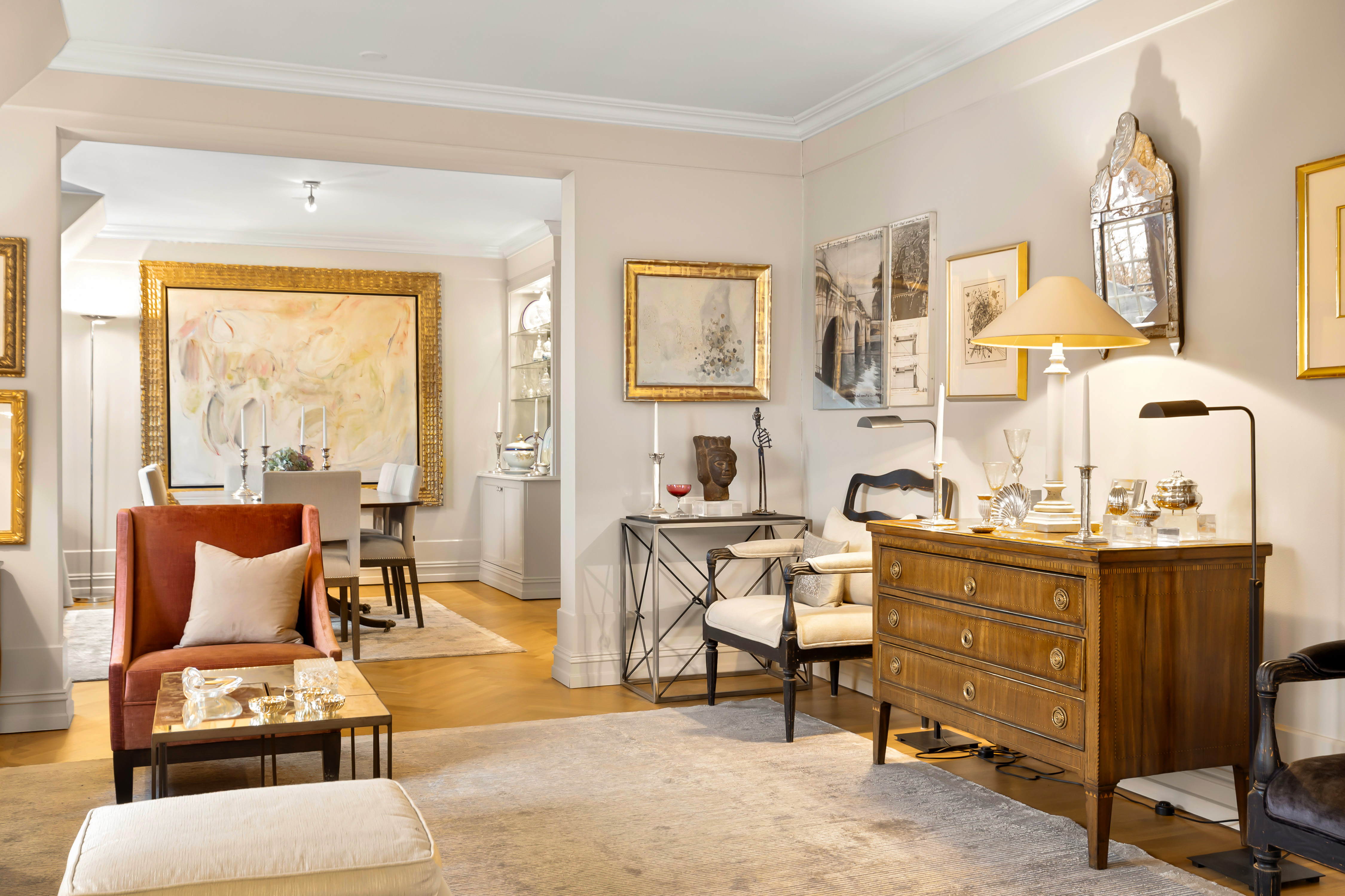 Fra Yvonne’s indre gemakker i leiligheten på Frogner. Kommoden, speil, stoler, lamper, lysestakene og objektene som er på bildet kan du se på auksjon hos Nyborgs. Foto: Morten Henden Aamot