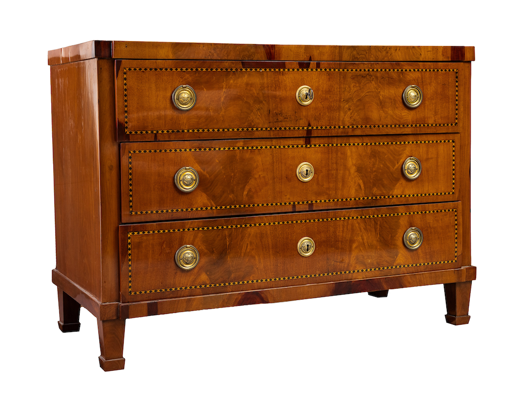 Tidlig 1800-talls gustaviansk kommode med finér av mahogni, frukttre og ibenholt. Vurdering 10.000-12.000 med minstepris 6.000. Selges på Nyborgs Vårauksjon Del I. Foto: Nyborgs auksjoner