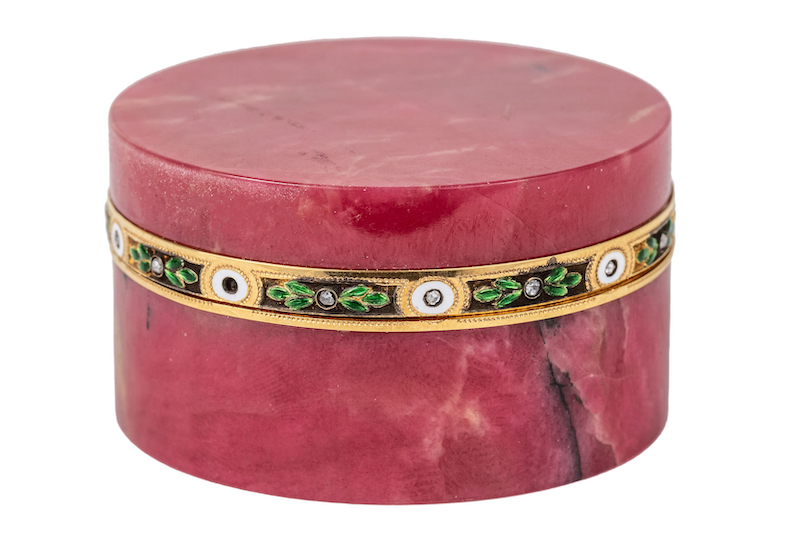 Lokkboks fra Fabergé. Utført i rosa rhodokrositt med montering i 18K gult gull, emalje og roseslepne diamanter. Vurdering 20.000-30.000 med minstepris 15.000. Selges på Nyborgs Vårauksjon Del I. Foto: Nyborgs auksjoner